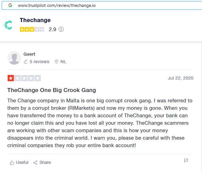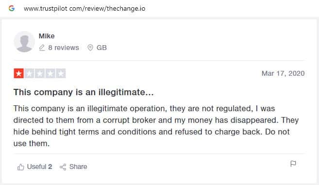 В глобальной сети-интернет мало пользовательских отзывов о криптолохотроне TheChange, что говорит о том, что мошенники подчищают информацию о своей организации.