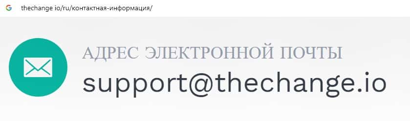 Мошенники Зе Чэиндж на своем официальном интернет-ресурсе указывают адрес электронной почты, а именно: