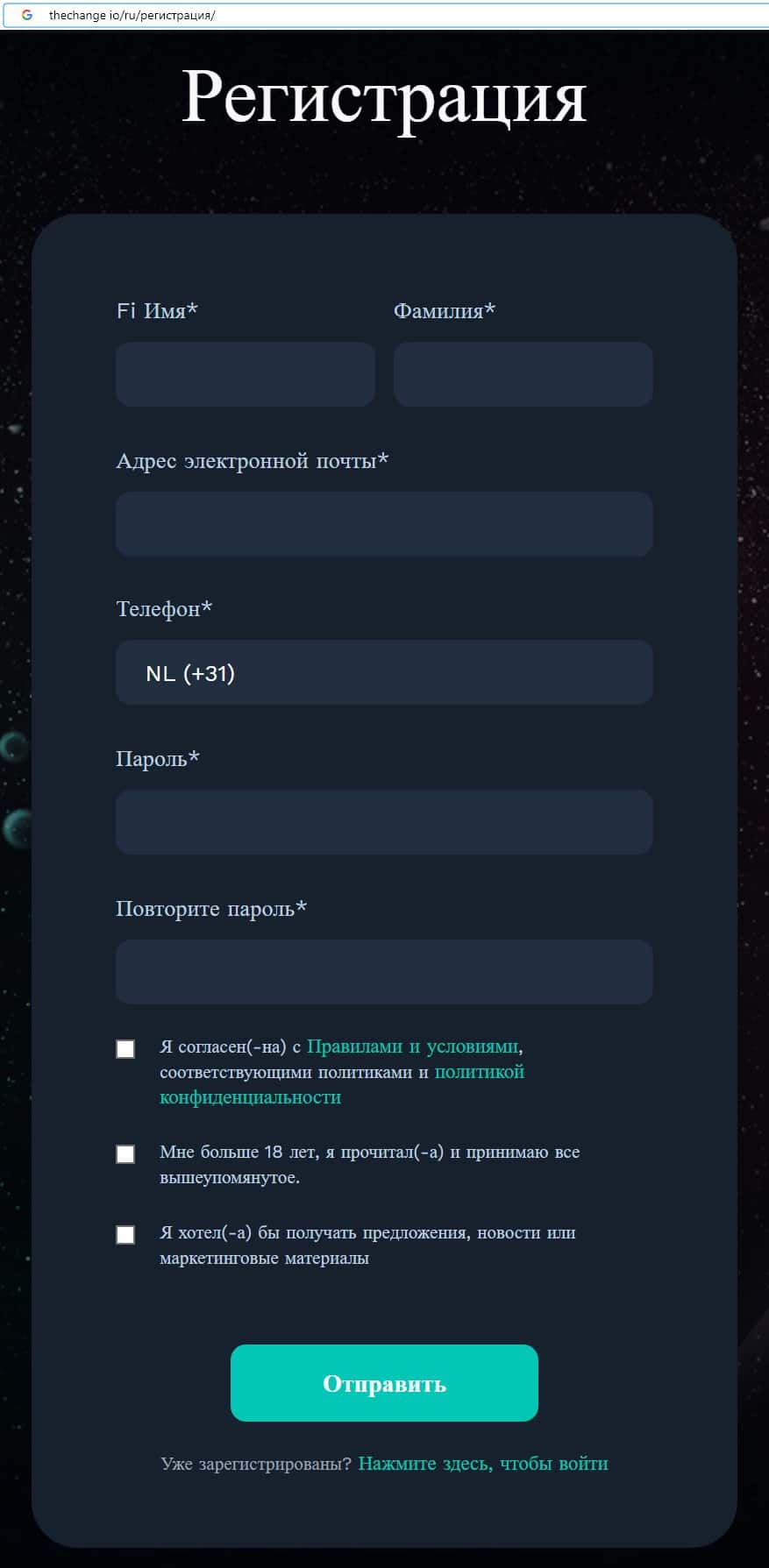 В данном разделе предлагаем увидеть скрин главной веб-страницы онлайн-сервиса скам-компании Зе Чэиндж, помните о том, что проекты часто меняют название домена своего сайта.