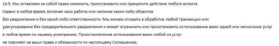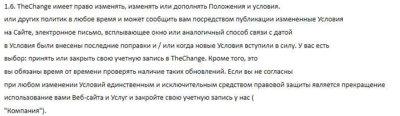 Аферисты The Change уведомляют пользователей своего сайта о том, что контора вправе без предварительного уведомления приостановить предоставление любой услуги компании.