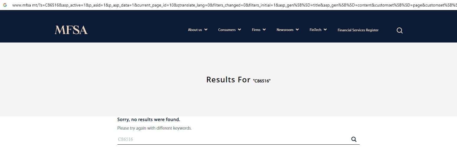 На официальном сайте финансового регулятора Мальты mfsa mt нет никакой информации об указанном регистрационном номере компании The Change.