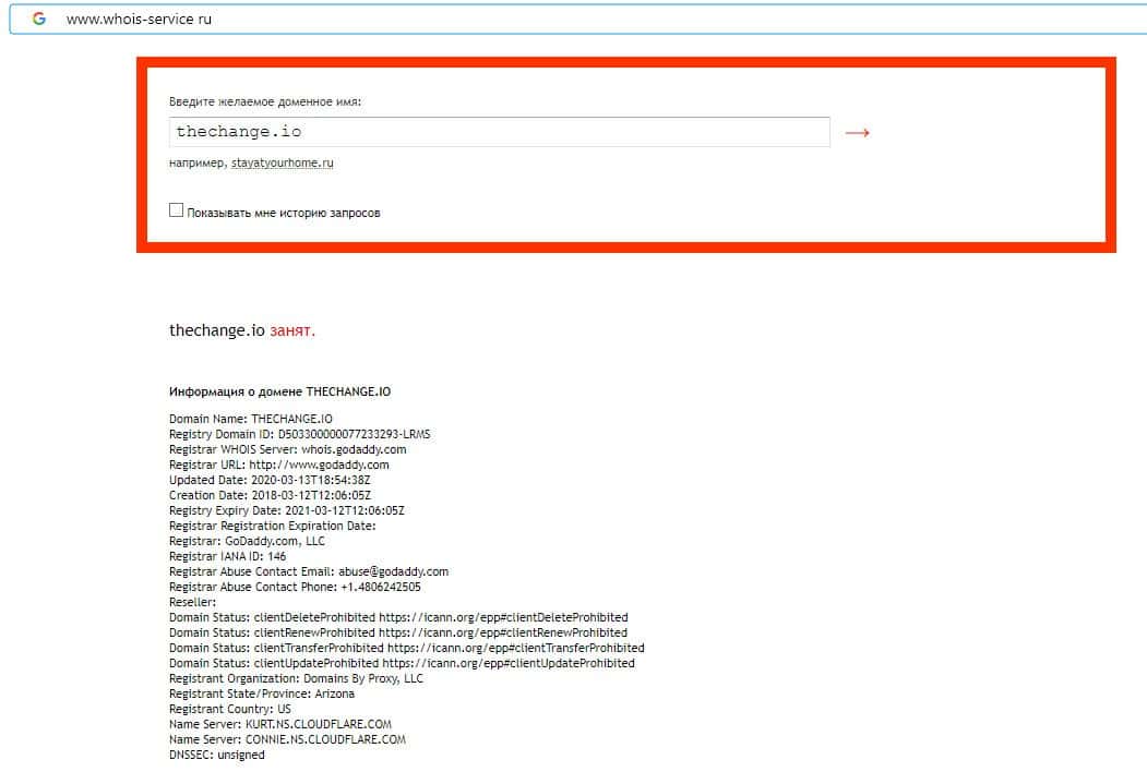 - Данные о владельце домена компании Зе Чэиндж отсутствуют