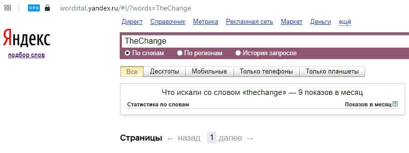 Количество брендовых запросов названия компании на английском языке "TheChange" на Яндекс Вордстарт составило 9 запросов за месяц.