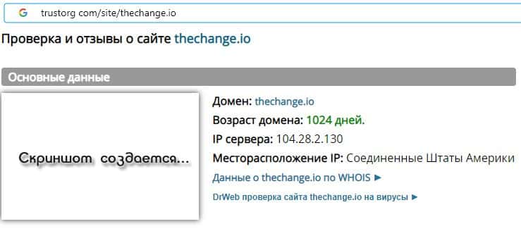 Проверка интернет-сервиса аферистов The Change на trustorg com показала, что возраст домена к моменту написания статьи составляет 1024 дня, вероятнее всего домен купленный.