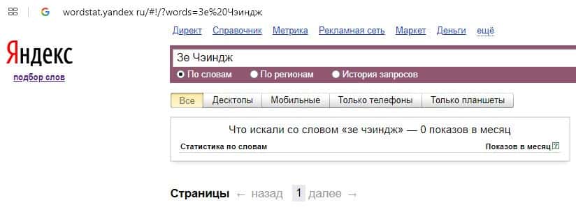 Количество брендовых запросов названия компании на русском языке "Зе Чэиндж" на Вордстарт Яндекс Ру вероятно равно 0.