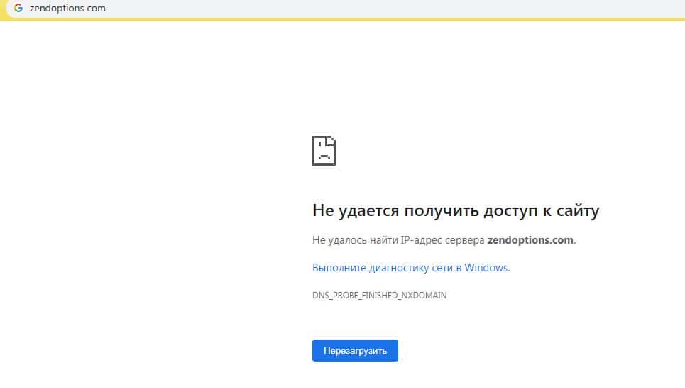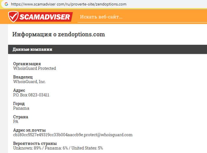 Согласно информации, предоставляемом на интернет-площадке scamadviser com, в настоящем времени реально домен ZendOptions не имеет сайта. Еще один известный ресурс подтвердил отсутствие какой-либо информации и самого домена липового дилингового центра Зенд Опционс, который просто прикрыл всю свою мошенническую структуру.