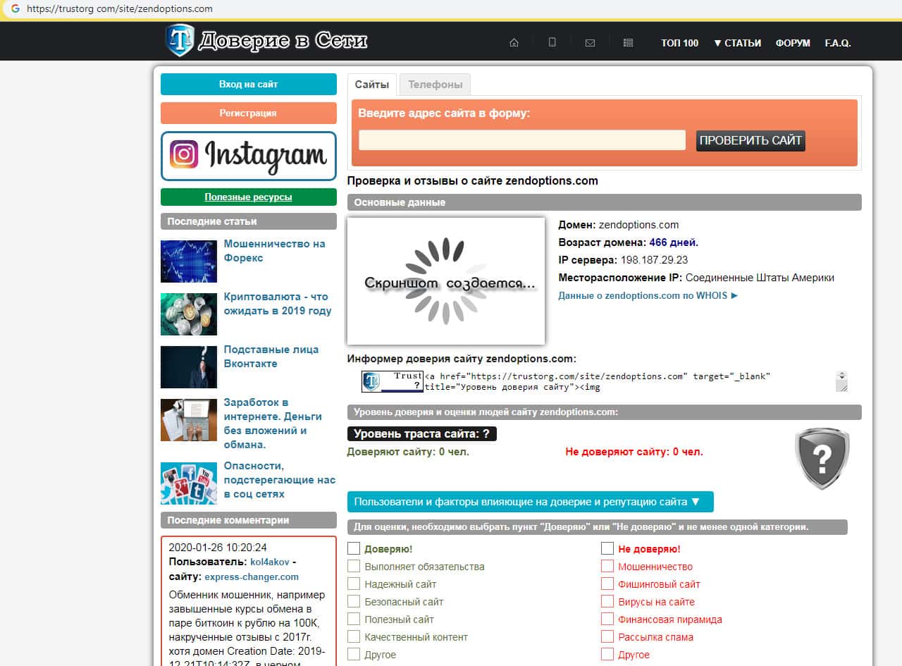 Согласно данным с уважаемого сайта трасторг ком, определен возраст домена веб-ресурса липового брокера ZendOptions. Помимо этого, невозможно проследить абсолютно ничего о интернет-странице слившегося брокера: у него нет ни оценок, ни комментариев в системе. В общем, мошенники стерли о себе всю информацию, чтобы уйти от ответственности.