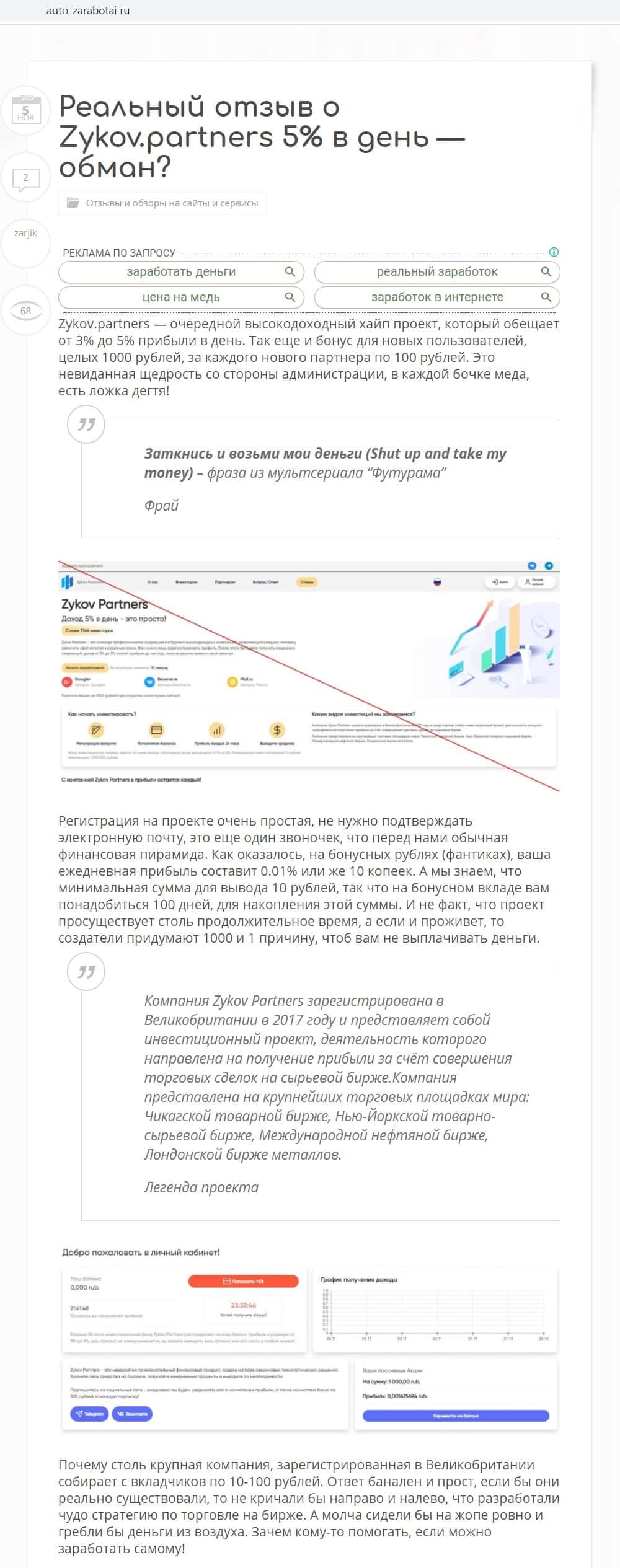 По мнению авторов статьи на сайте auto-zarabotai ru, контора Жуков Партнерс вообще не существует, это банальный развод на деньги в интернете посредством хайпа.
