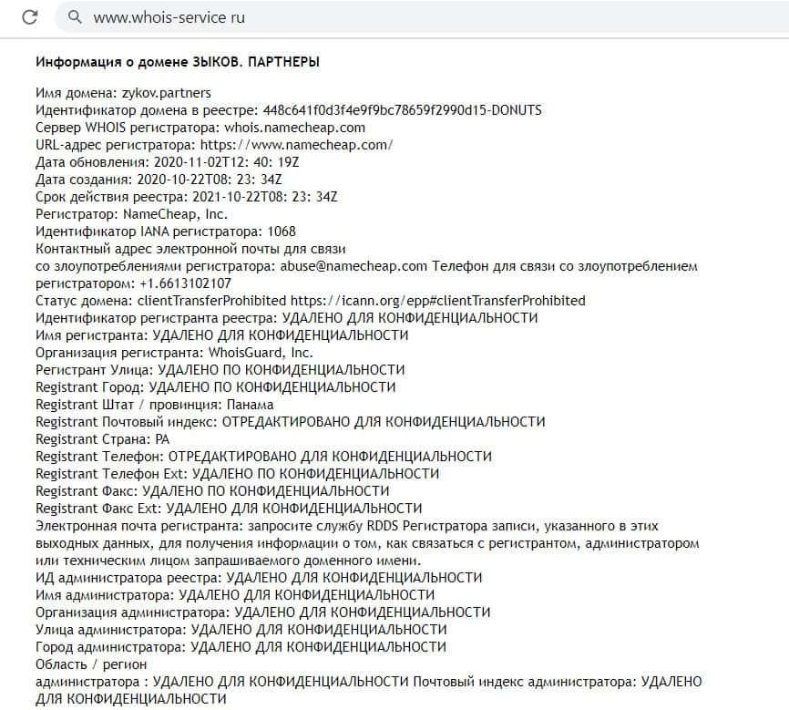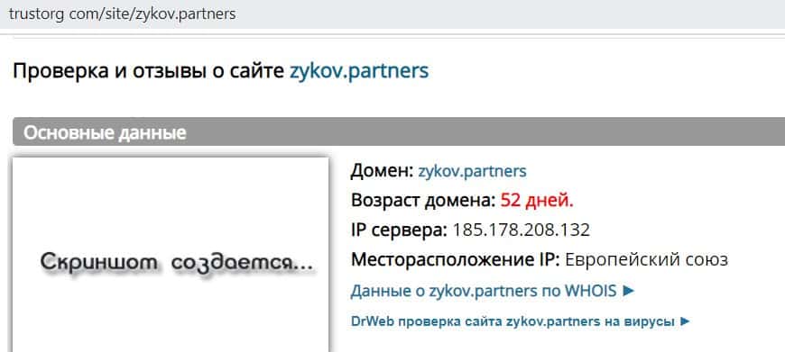 Кому принадлежит доменное имя сайта zykov partners, выяснить не удалось, так как регистрант скрыл свою организацию. Это признак того, что данная компания - лохотрон.