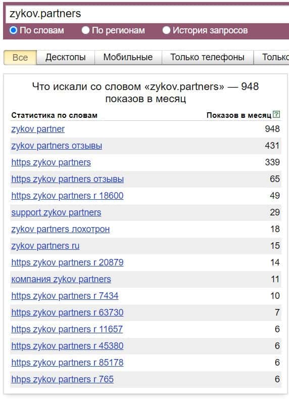 Количество запросов по домену "zykov.partners" с точкой, совершенных пользователями в сервисе Яндекс, равняется 948 показам.