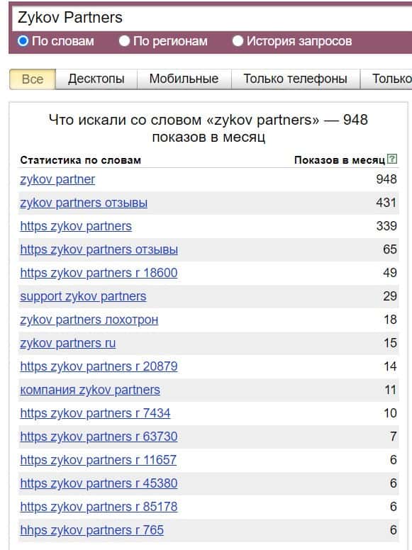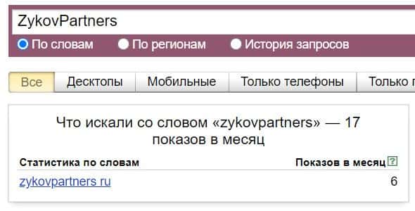 Проверка по названию бренда на английском языке с пробелом "Zykov Partners" дала следующий результат: 948 показов.