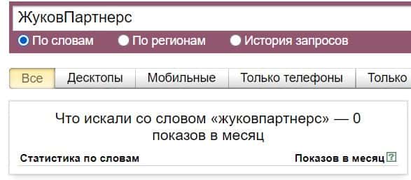 Название бренда "ЖуковПартнерс" на русском языке люди не искали в системе Яндекс ни одного раза за месяц.