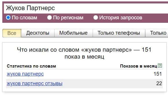 То же название, но написанное с пробелом "Жуков Партнерс", люди пытались найти в системе Яндекс с таким результатом: 151 показ в месяц.
