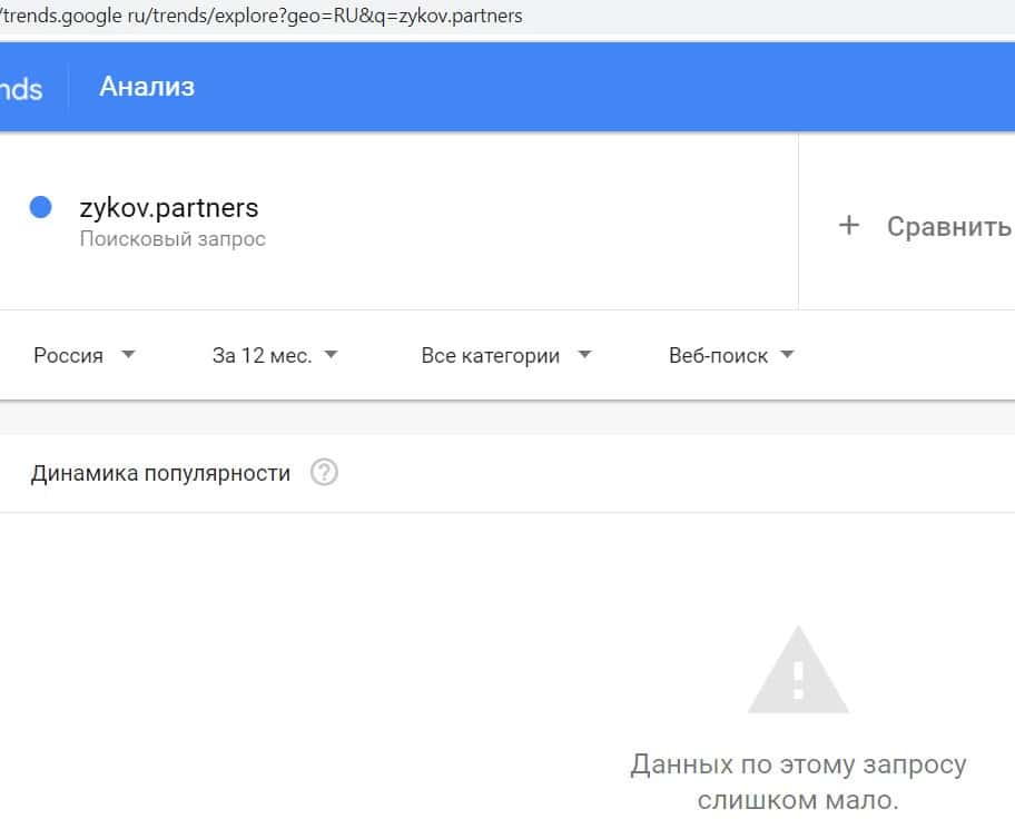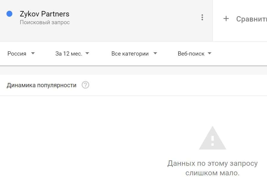 Проверка по названию бренда на английском языке с пробелом "Zykov Partners" дала следующий результат: компанию искали крайне редко.