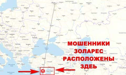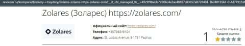 Что касается официальных дынных конторы Zolares, то здесь представлена информация о местоположении главного офиса аферистов. Как оказалось они находятся на острове Кипр.