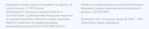 Что касается регуляции деятельности конторы Золарес, то здесь мошенники перечислили всех известных регуляторов. Хотя нет ни единого подтверждения их лицензированности.