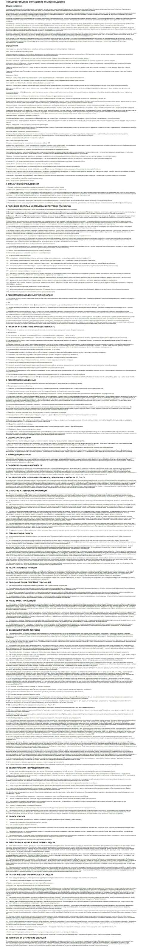 Далее представлена полная версия соглашения мошеннической конторы Zolares, где определенно указывается информация о всех подводных камнях которые ожидают каждого клиента.