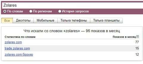 А вот англоязычное название бренда "Zolares" мошенники немного распространили в поисковой системе Яндекс и набрали порядка 96 показов за месяц.