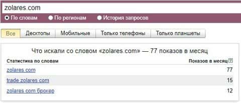Что касается запроса самого сайта бренда "zolares.com" то здесь набрано порядка 77 показов за последний месяц, и это особая опасность для русскоязычного населения.