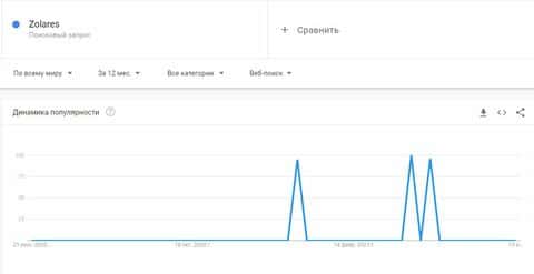 Далее представлена статистика по бренду мошенников англоязычной версии "Zolares", которая популярна средне и запросы в Гугл.
