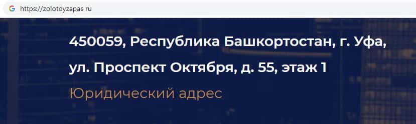 Лохотронщики Zolotoy Zapas указали адрес местонахождения главного офиса своей компании, который наверняка липовый: