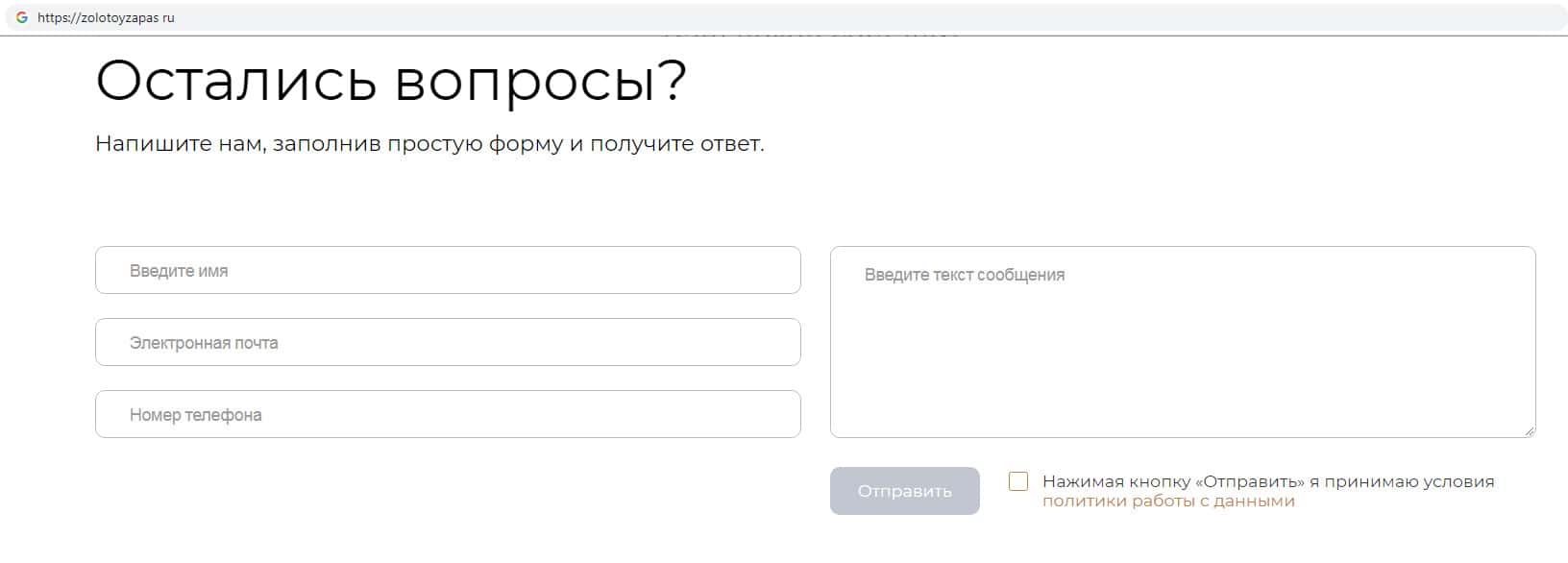 Шулера Золотой Запас предлагают пользователям заполнить бланк обратной связи, где просят указать свое имя, адрес электронной почты, а также номер контактного телефона.