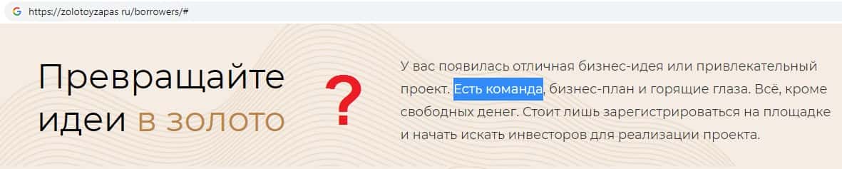 В данном разделе предлагаем увидеть скрин главной веб-страницы онлайн-ресурса конторы Золотой Запас, которая обманывает людей на немалые суммы денег.
