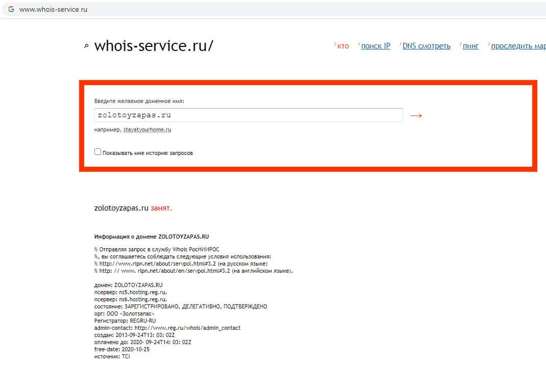 В данном разделе можно увидеть сведения о периоде существования домена, который на данный момент принадлежит аферистам в лице компании Золотой Запас.