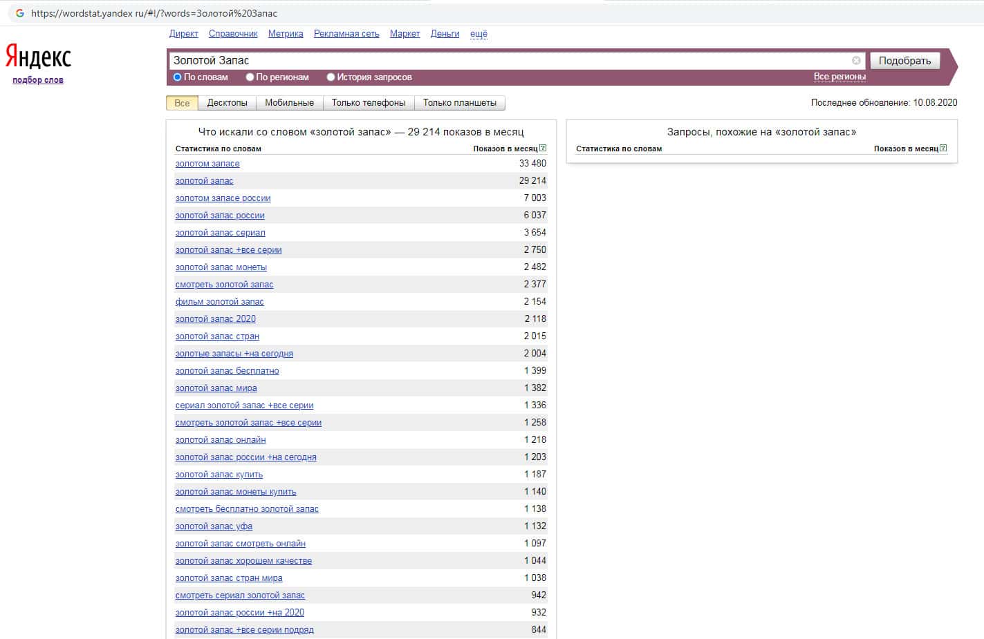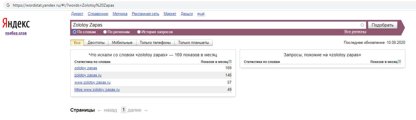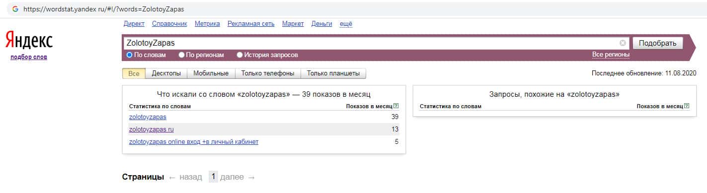 По запросам по бренду названия компании на английском языке без пробела "ZolotoyZapas" в поисковике Yandex показатель 39 запросов за месяц.