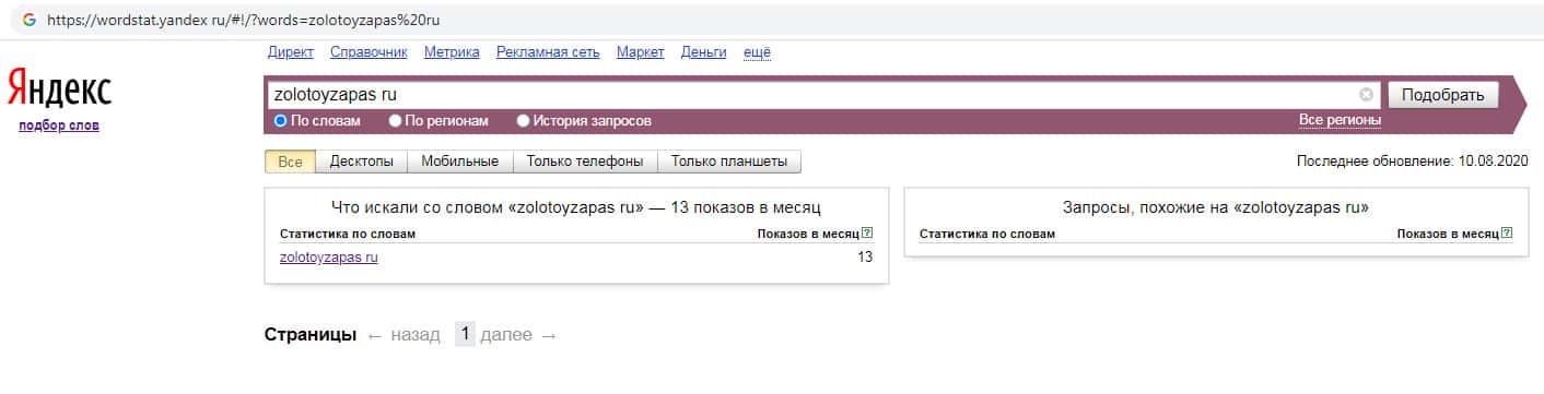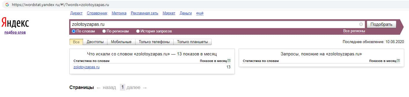 По запросам по бренду названия домена без точки "zolotoyzapas ru" на wordstat yandex ru тот же показатель, а именно 13 запросов за месяц.