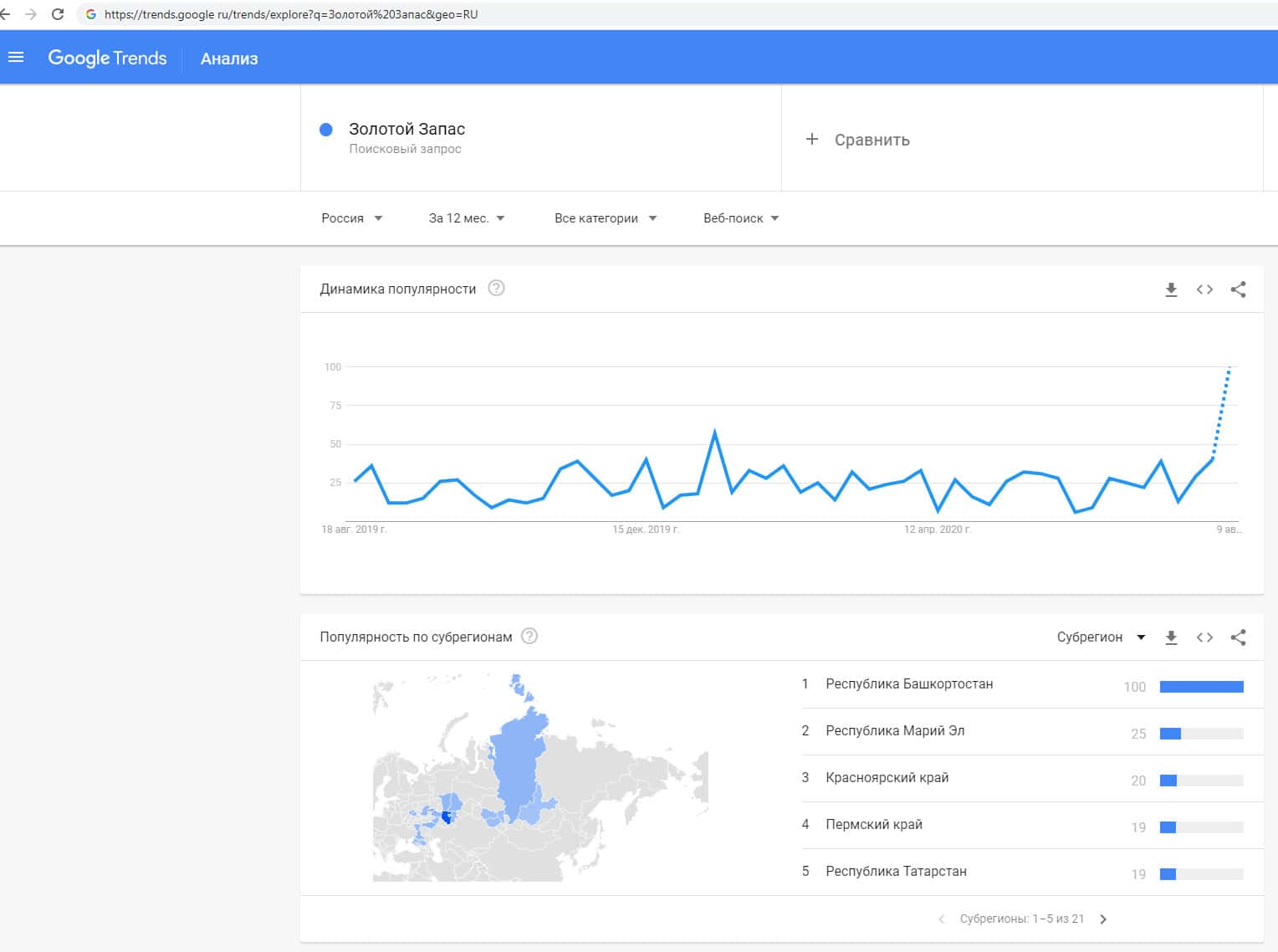 Также нет никакой информации о брендовых запросах названия компании на английском языке без пробела "ZolotoyZapas" на Трендс Гугл Ру.