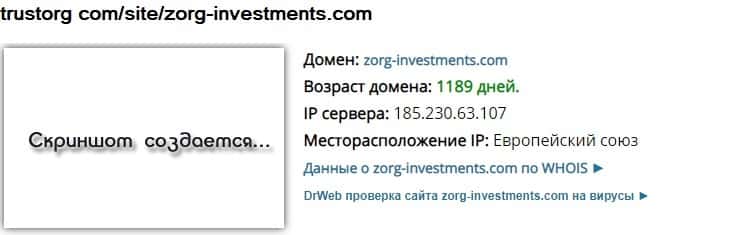 Срок существования домена zorg-investments com - 1189 дней. Это существенный срок, в течение которого можно обмануть большое количество людей на деньги.