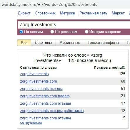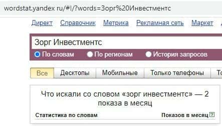 Первый запрос в Яндекс на русском языке с одним пробелом "Зорг Инвестментс" выдает результат в 2 показа в месяц.