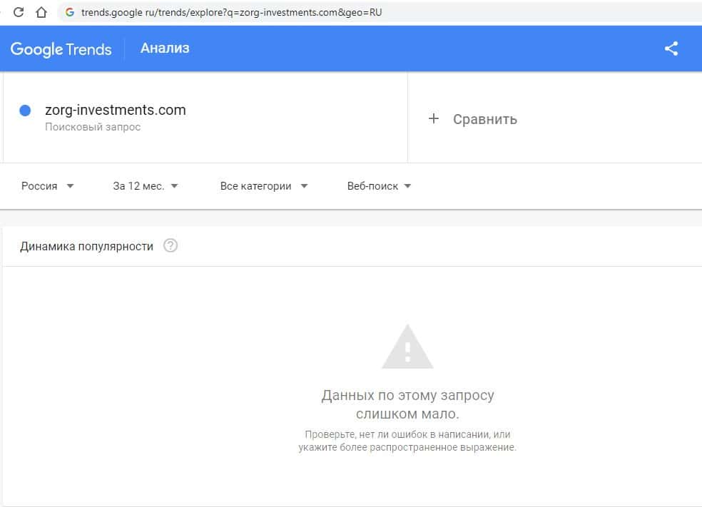 Третий запрос Google на английском языке без пробелов и с точкой "zorg-investments.com" выдает результат в 0 показа в месяц. По такому запросу информацию не ищут.