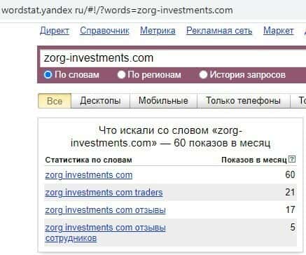 Третий и последний запрос в яндексе на английском языке "zorg-investments.com" выдает результат в 60 показов в месяц. Это меньше, чем во втором случае, но больше, чем в первом.