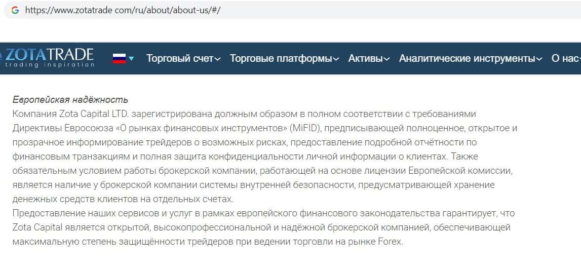 На своём главном интернет ресурсе компания финансовых лохотронщиков представила пользователям своё юридическое лицо, которым свою очередь оказалась компания Zota Capital LTD.