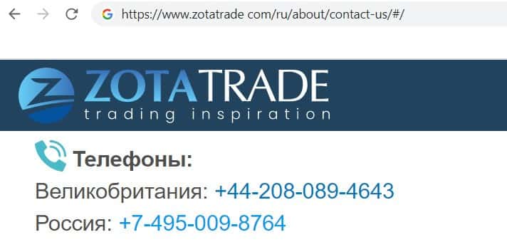 Мошенническая организация Зота Трейд на своём сайте указала номера телефонов, с которых компания звонит интернет - пользователям и призывают их сотрудничать с лохотроном. Номера жуликов: