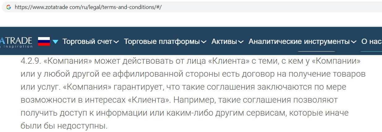 Так же фирма финансовых разводил Зота Трейд в своём соглашение указала, что имеет полное право действовать от имени клиента, что позволит фирме сливать счёт клиента.