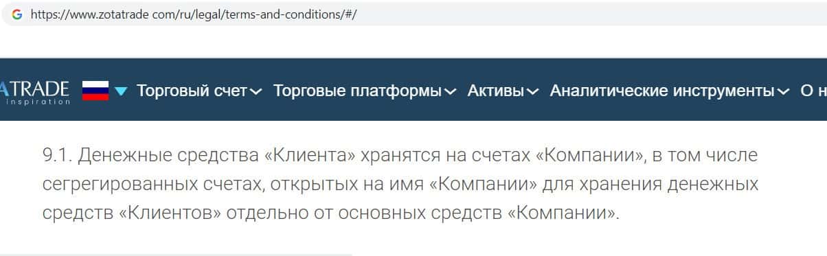 Компания разводил ZotaTrade указала, что все деньги клиента хранятся на счетах фирмы, хоть и отдельно от денег компании, но всё равно все средства клиентов находятся в руках мошенников.