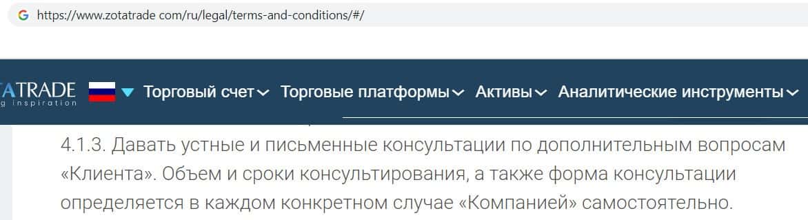 Клиентское соглашение фирмы финансовых лохотронщиков Зота Трейд