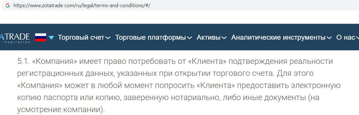 Так же жулики Зота Трейд указали, что в любо момент могут потребовать у клиента его личные данные, которые фирма может использовать в мошеннических целях, или передать данные своим подельникам.