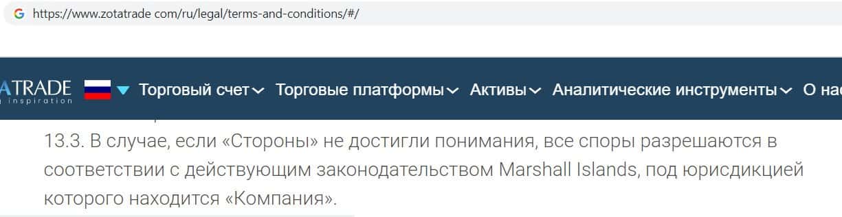 А в данном пункте фирма кидал ZotaTrade указала, что споры с компанией будут решаться только в судебном порядке и по законам Маршаловых островов. куда пользователи попасть не смогут.