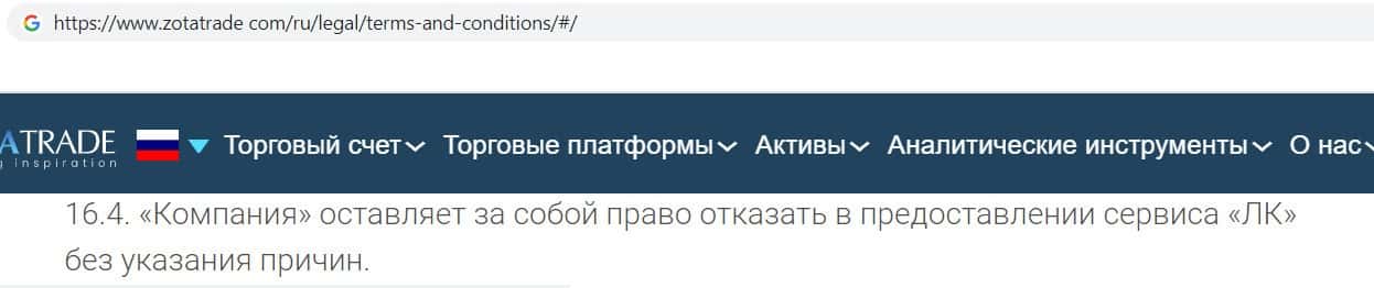 Так же фирма кидал ZotaTrade указала, что имеет полное право отказать клиентам в доступе в личный кабинет без объяснения причины, лишь по собственному усмотрению.