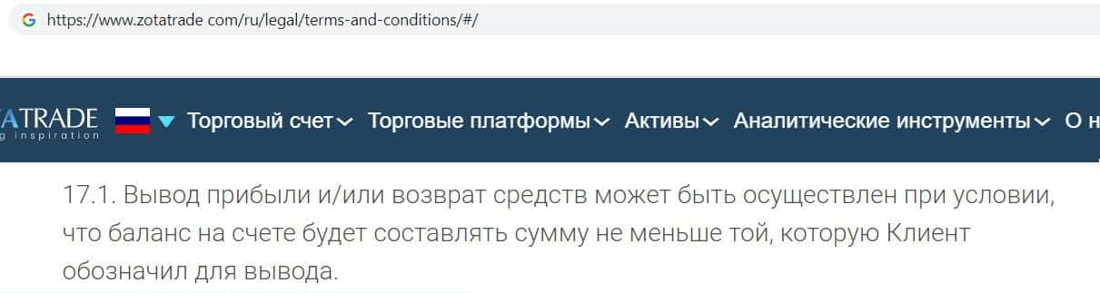 А в данном пункте, компания ZotaTrade указала, что клиент может вывести средства лишь в том случае, если на его счету останется сумма, которая превышает сумму, которую он выводит.