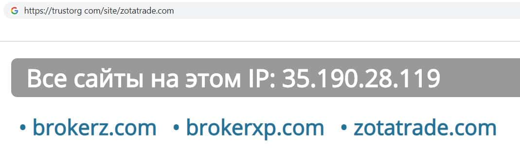 С помощью сайта "Доверие в сети мы узнали, что мошенническая компания ZotaTrade пользуется одним и тем же айпи с ещё одним лохотроном. Возможно этот оба проекта одних мошенников.