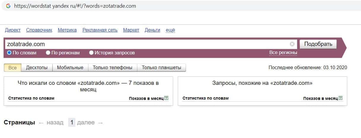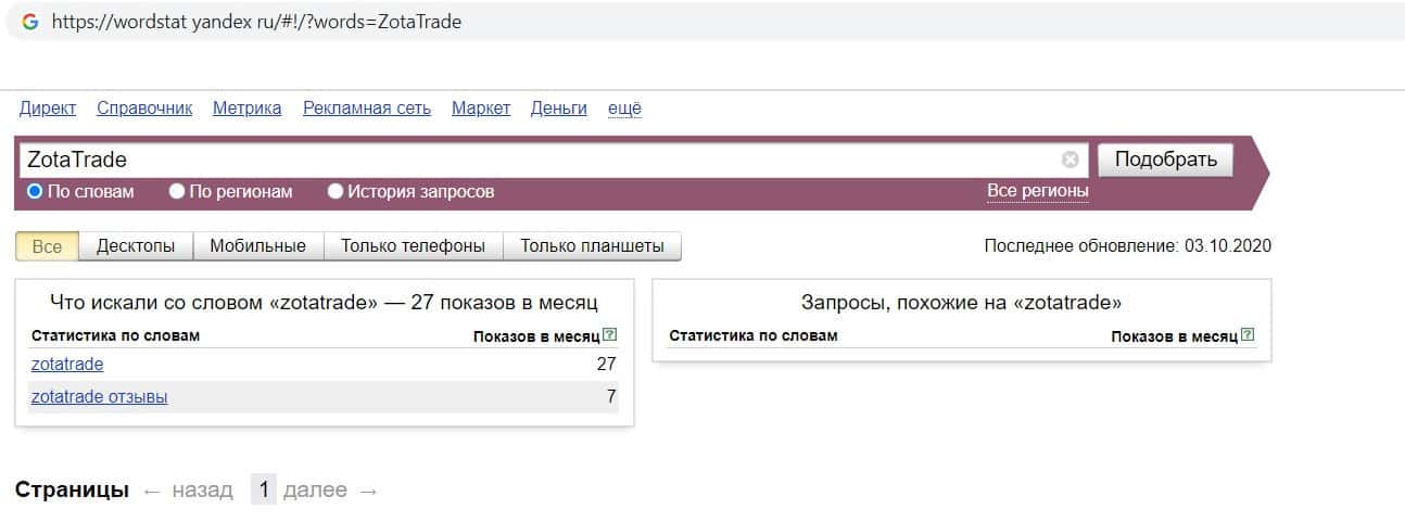 Мы проверили количество запросов компании ZotaTrade в Яндексе по названию фирмы, а именно "ZotaTrade". 27 раз пользователи выполняли данный запрос за последний месяц.