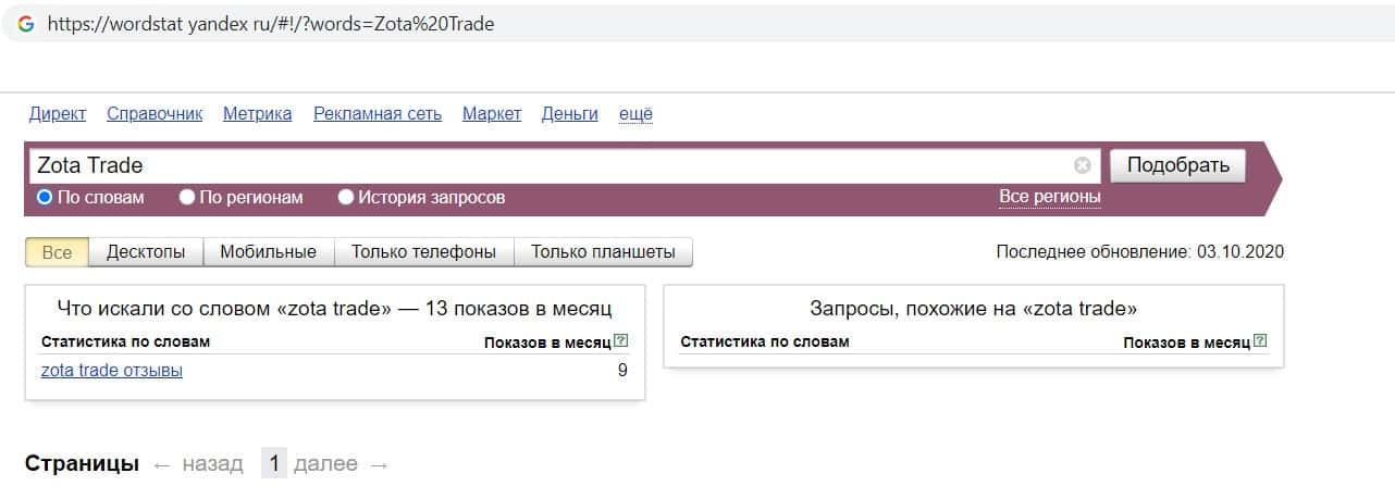 Далее мы проверили количество запросов компании разводил ZotaTrade по русскоязычному названию, а именно "Зота Трейд". Но данный запрос так же никто не выполнял.
