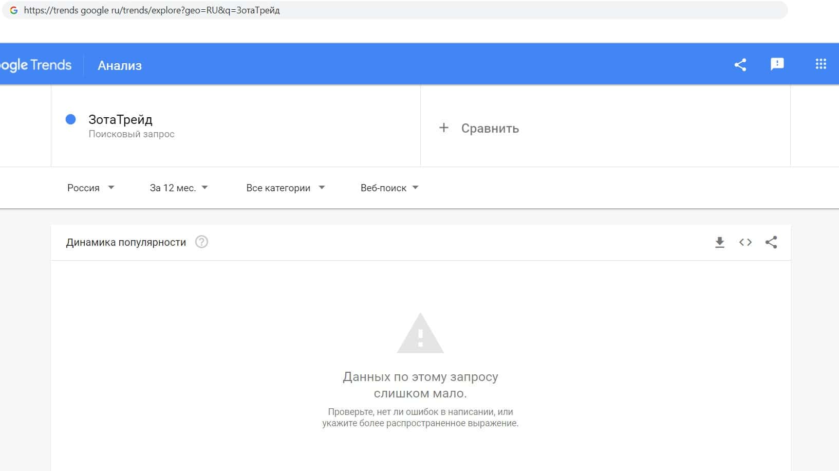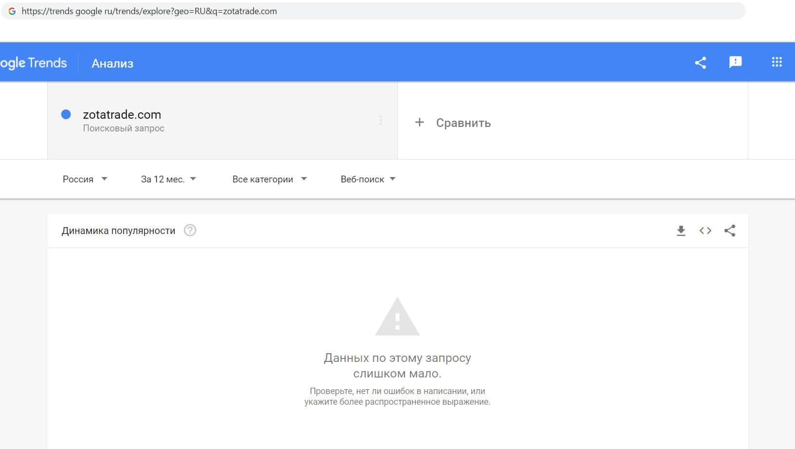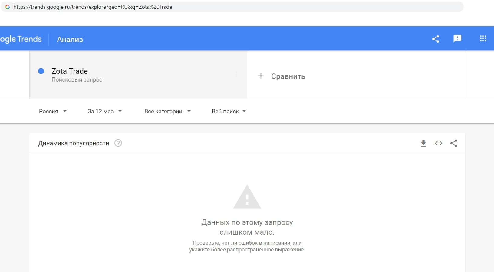 Так же мы проверили количество запросов мошеннической организации ZotaTrade по названию компании с пробелом, а именно " Zota Trade". Но результат оказался - нулевым.