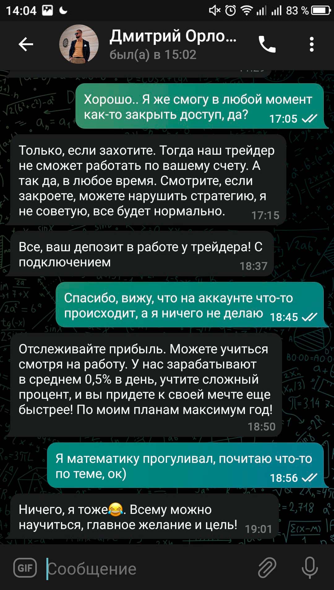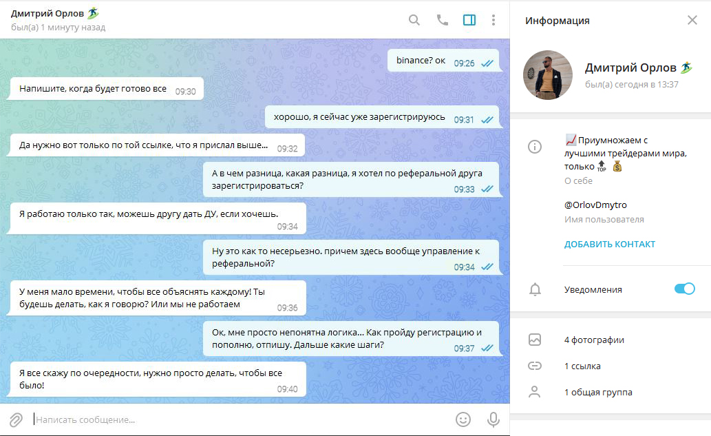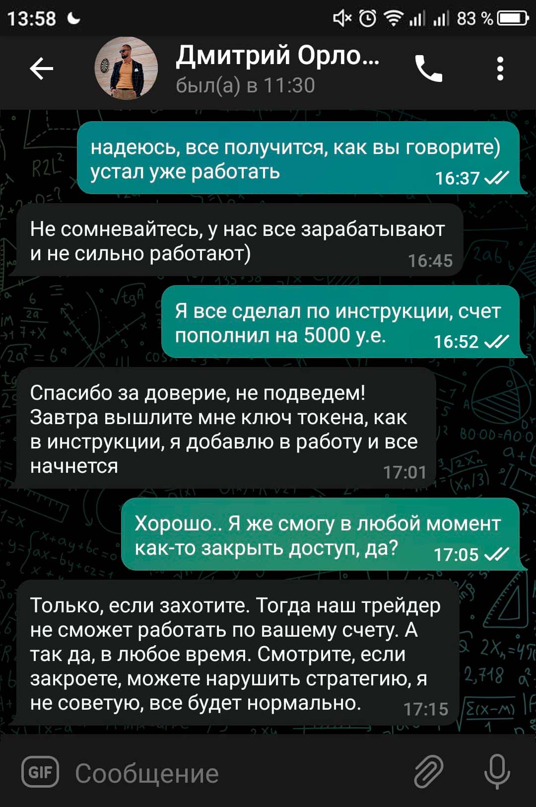 Я писал ему в личные сообщения, а он игнорировал. Потом просто заблокировал меня там. Я начал писать в группе общей группу в комментариях о ситуации, он запретил мне писать и в голосовом сказал, что я засланный казачок от конкурентов и никогда не был реальным клиентом. Я хотел скинуть то, как фотографировал экран, как пополнил счет, как дал ключ, но у меня такой возможности не было. А через день он заблокировал меня уже везде, удалил с группы и даже из подписчиков его канала Orlov Capital в Телеграм.