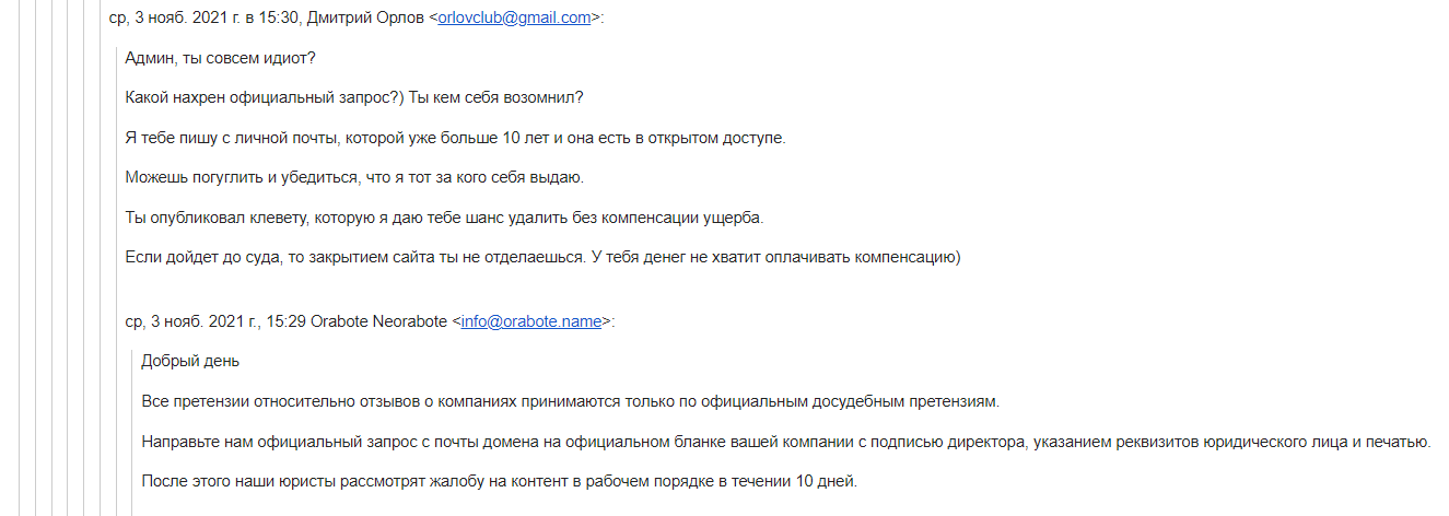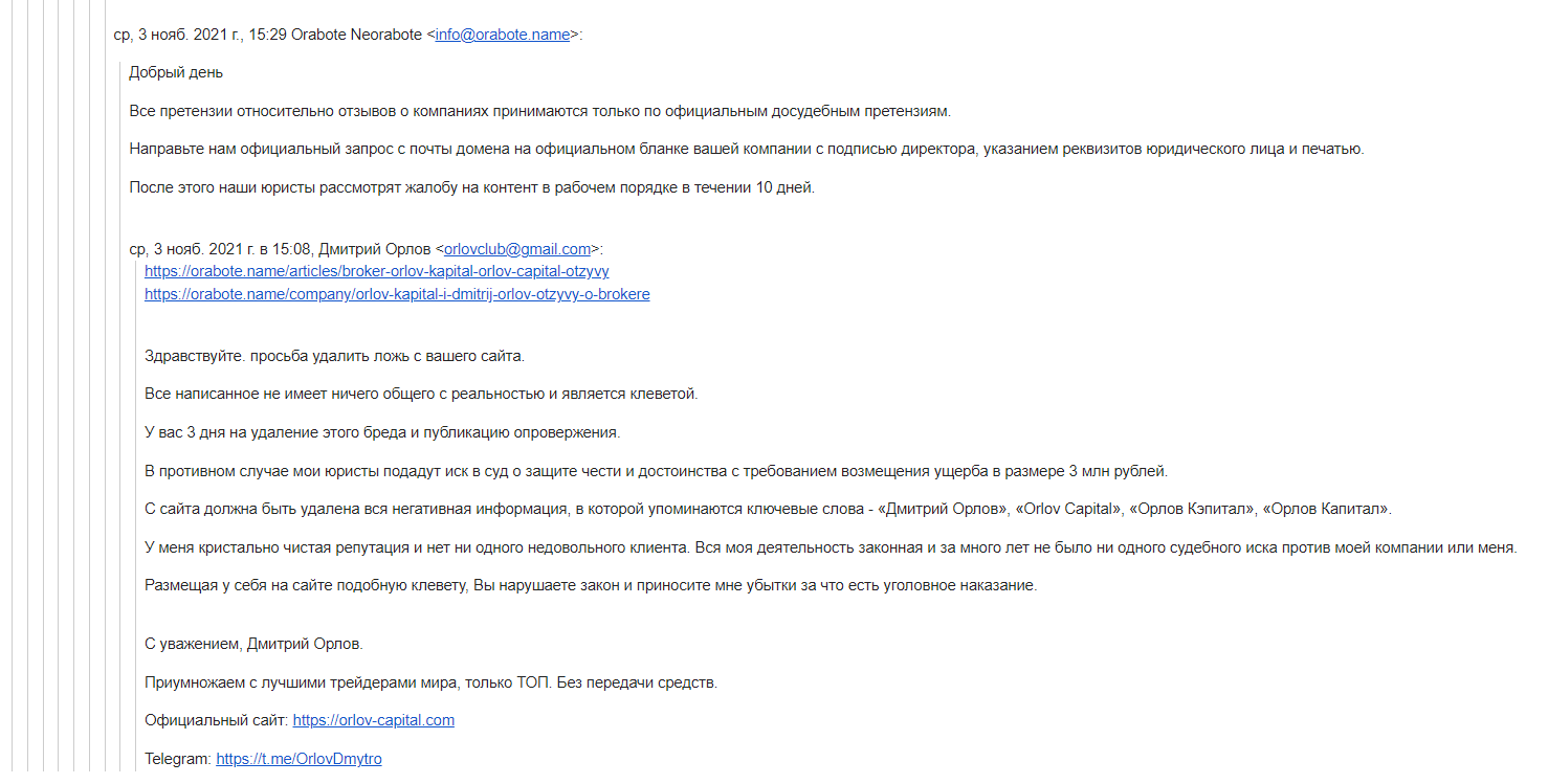 Администрации сайта «О работе и мошенниках» поступило письмо с электронной почты Дмитрия Орлова, где он потребовал удалить негативные отзывы с ключевыми словами «Дмитрий Орлов», «Orlov Capital», «Орлов Кэпитал», «Орлов Капитал». Угрожал судебным разбирательством по отношению к администрации нашего сайта. Как всегда все основывалось на том, что его деятельность законна и все написанное неправда. То есть десятки людей с потерянными деньгами это просто так.